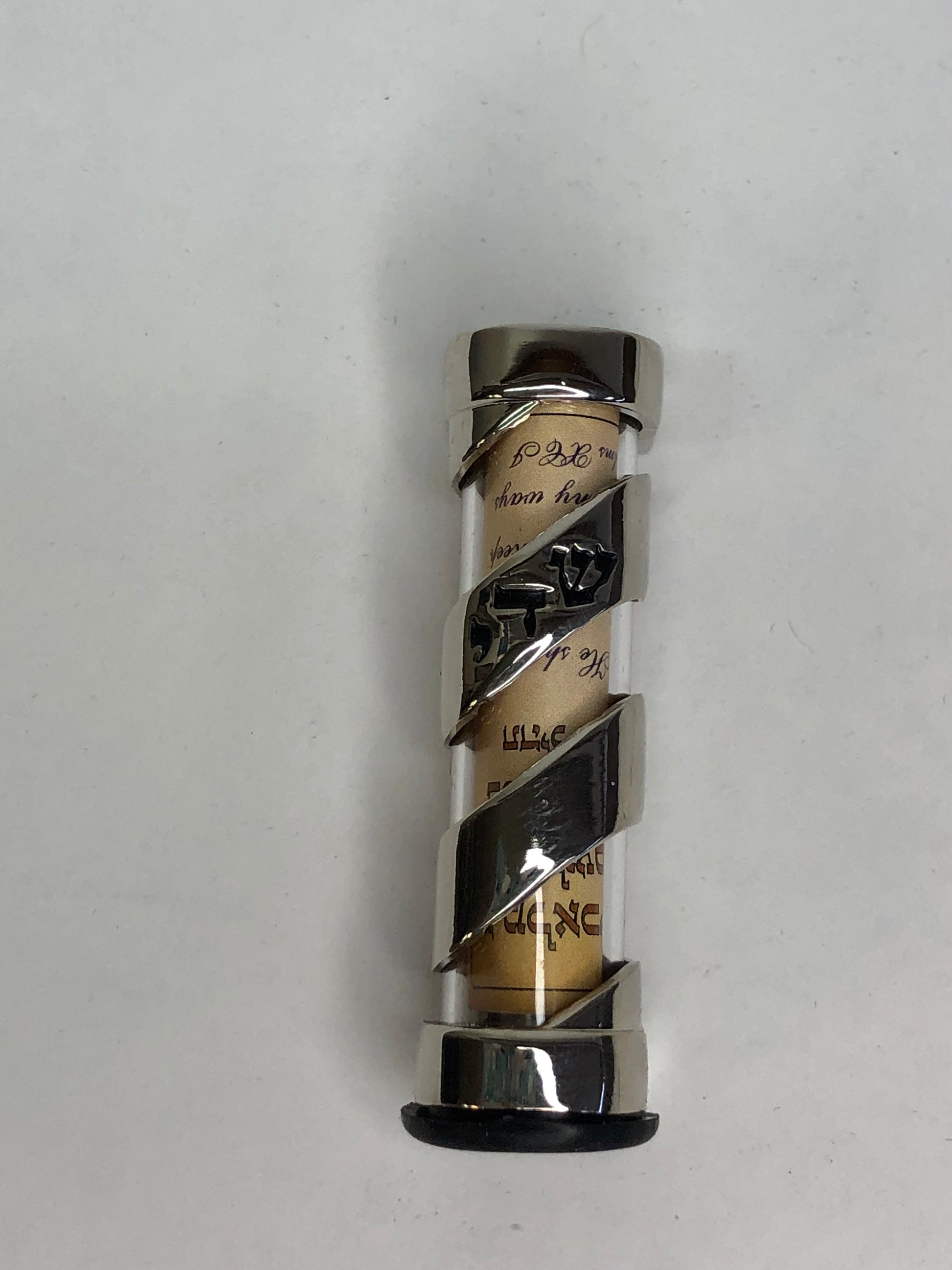 A nickel and acrilic car Mezuzah- containing Psalm 91:11 "For He shall give His angels charge over thee, to keep thee in thy ways."